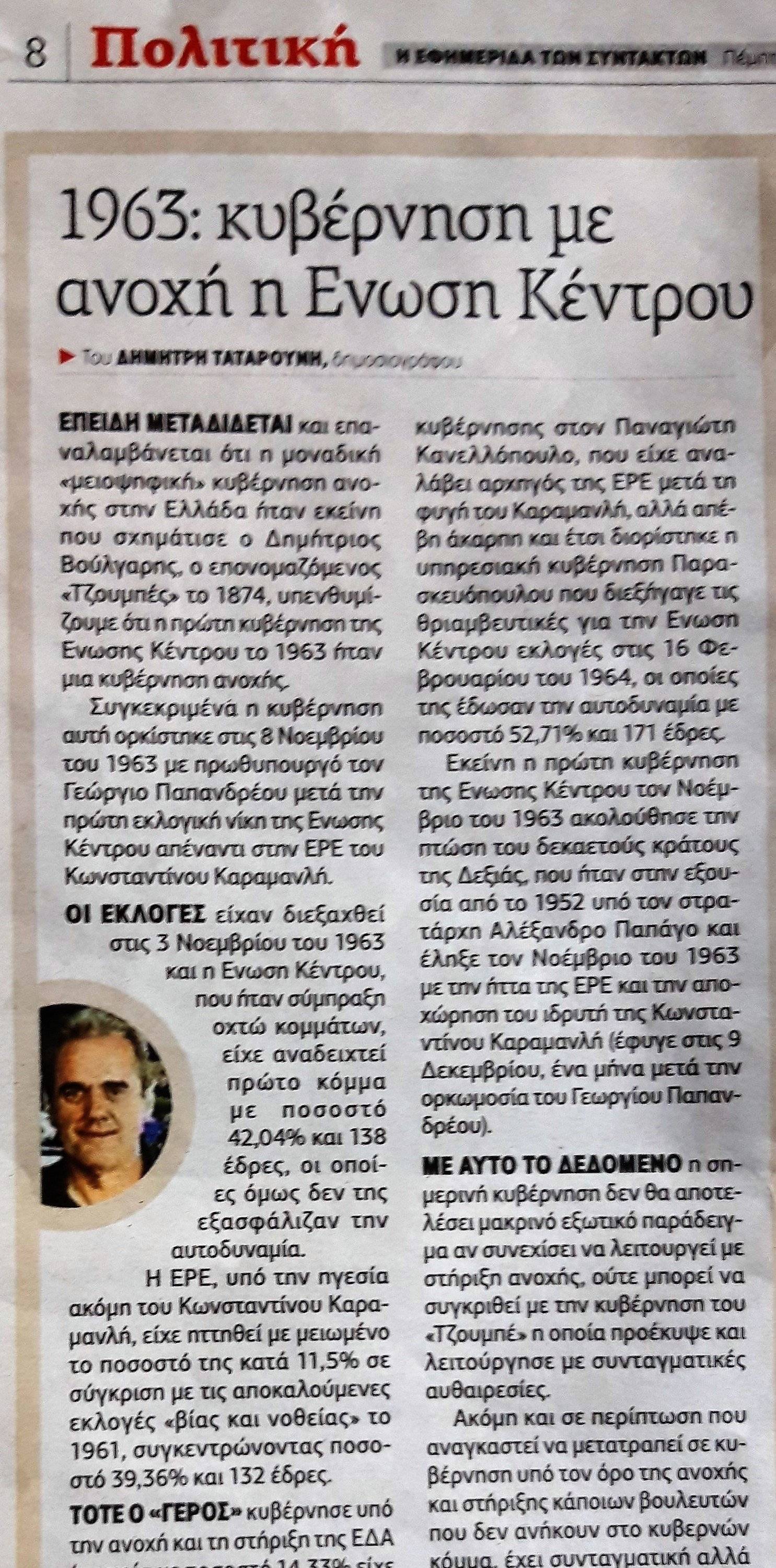 Επειδή μεταδίδεται και επαναλαμβάνεται ότι η μοναδική «μειοψηφική» κυβέρνηση ανοχής στην Ελλάδα ήταν εκείνη που σχημάτισε ο Δημήτριος Βούλγαρης ο επονομαζόμενος «Τζουμπές» το 1874, υπενθυμίζουμε ότι η πρώτη κυβέρνηση της Ένωσης Κέντρου το 1963 ήταν μία κυβέρνηση ανοχής.