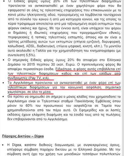Τα βασικά σημεία ήταν να επιβληθεί φόρος στη συνδρομητική τηλεόραση, όπως και έγινε, να αντικατασταθεί ο ειδικός φόρος τηλεόρασης 20% από έναν μικρότερο φόρο που θα εφαρμοζόταν σε όλες τις εκδοτικές επιχειρήσεις και να αντικατασταθεί το αγγελιόσημο «με έναν φόρο επί των τηλεοπτικών διαφημίσεων για την κοινωνική ασφάλιση, σημαντικά χαμηλότερο, σε όλα τα Μέσα». Η ΕΙΤΗΣΕΕ ισχυριζόταν, ψευδώς, πως μόνο οι εθνικής εμβέλειας σταθμοί χρηματοδοτούσαν το αγγελιόσημο, ενώ στην πραγματικότητα ήταν επιβάρυνση στην τιμή της διαφήμισης (21,5%).