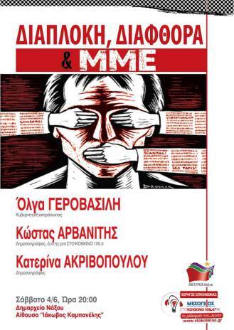 Για να συζητήσουμε, μάλιστα, ένα ιδιαίτερα σημαντικό θέμα όπως η λειτουργία των Μέσων Μαζικής Ενημέρωσης και οι σχέσεις διαπλοκής που έχουν αναπτυχθεί με οικονομικά, επιχειρηματικά και πολιτικά συμφέροντα.