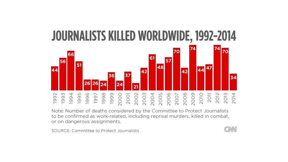 Σύμφωνα με την έκθεση της Διεθνούς Ομοσπονδίας Δημοσιογράφων (ΔΟΔ) που δημοσιεύει η ΕΣΗΕΑ, ο παγκόσμος απολογισμός των δημοσιογράφων που έπεσαν στο καθήκον υπήρξε βαρύς το 2015, καθώς δεκάδες λειτουργοί της ενημέρωσης δολοφονήθηκαν σε τριάντα διαφορετικές χώρες. Οι δημοσιογράφοι είναι οι μόνοι επαγελματίες που πληρώνουν με τόσο αίμα μόνο και μόνο επειδή κάνουν τη δουλειά τους: