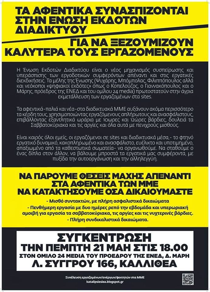 Αναδημοσιεύω ένα κείμενο πού έγραψα πριν τις εθνικές εκλογές του Γενάρη, έν όψει της διαδήλωσης του νέου δημοσιογραφικού υποπρολεταριάτου στα Ιντερνετικά ΜΜΕ, στις 21 Μαϊου 2015, στις 18:00, έξω από τον «Ομιλο 24» του προέδρου της εργοδοτικής Ενωσης ιδιοκτητών εταιρειών διαδικτύου (ΕΝΕΔ), Δ. Μάρη. Η Ενωση αυτή -όπως είναι γνωστό- δημιουργήθηκε από τους ίδιους διαπλεκόμενους εργοδότες που κατέχουν όλων των ειδών τα Μέσα (εφημερίδες, περιοδικά, ραδιόφωνα, τηλεοράσεις, digea, δορυφορικά, κ.λπ), εταιρείες διαφήμισεις, στοιχήματα, καράβια, ενέργεια, κατασκευές, ριαλ εστέιτ, τουρισμός, όπλα, διόδια …κόμματα κ.ο.κ