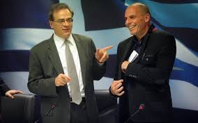 Ο Γκίκας Χαρδούβελης δείχνει τον Γιάνη Βαρουφάκη κατά την παράδοση του υπουργείου.