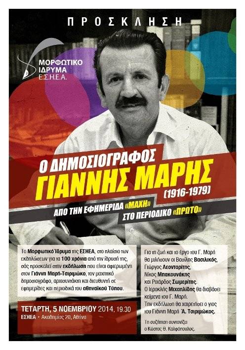 Το Μορφωτικό Ίδρυμα της ΕΣΗΕΑ, στο πλαίσιο του εορτασμού των 100 χρόνων από την ίδρυση της Ένωσης, διοργανώνει εκδήλωση για τον μαχητικό δημοσιογράφο, πρύτανη του αστυνομικού μυθιστορήματος στη χώρα μας, Γιάννη Μαρή-Τσιριμώκο, την Τετάρτη 5 Νοεμβρίου στις 7.30μμ στην αίθουσα εκδηλώσεων στα γραφεία της, στην οδό Ακαδημίας 20.
